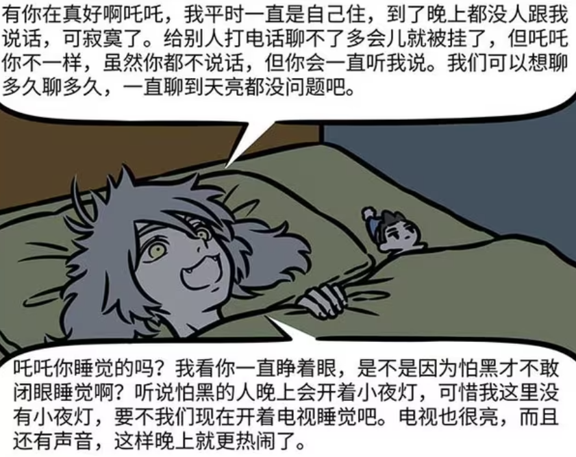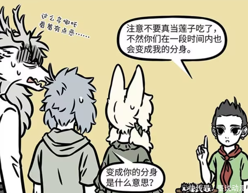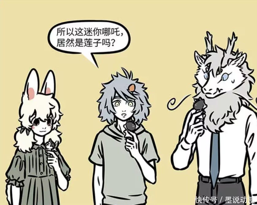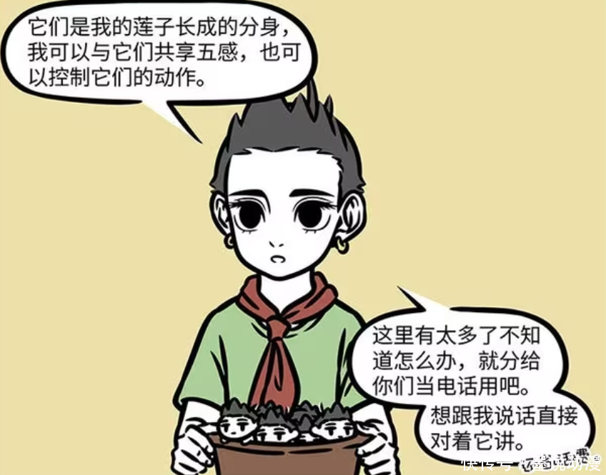 《非东说念主哉》漫画版中,哪吒的产出的莲子会形成我方的分身,在这里被名称为迷你哪吒。迷你哪吒领有通话功能,小玉、敖烈和哮天齐得到了一个。不外千万不成吃掉迷你哪吒,否则会像九月那样,形成哪吒分身。哮天取得一个迷你哪吒之后,那是如获至珍,更是恨不得一天二十四小时齐跟它聊天,不外最终是被哪吒用风火轮烧掉。