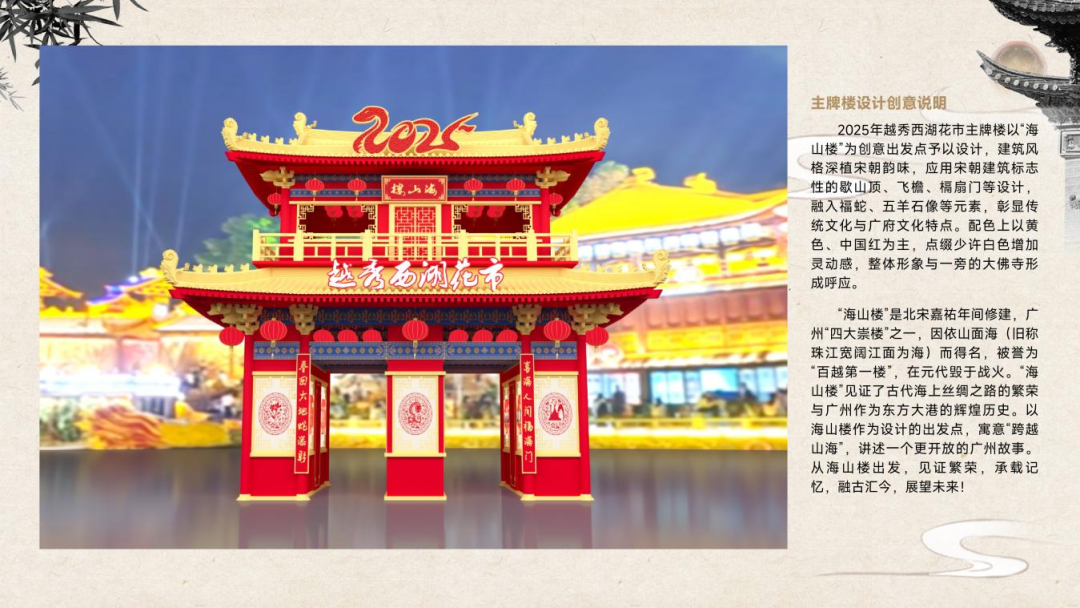 花市主牌坊以“海山楼”为原型打算,让西湖花市“卓越山海”,向市民旅客论说一个更绽开的千年商都广州故事。