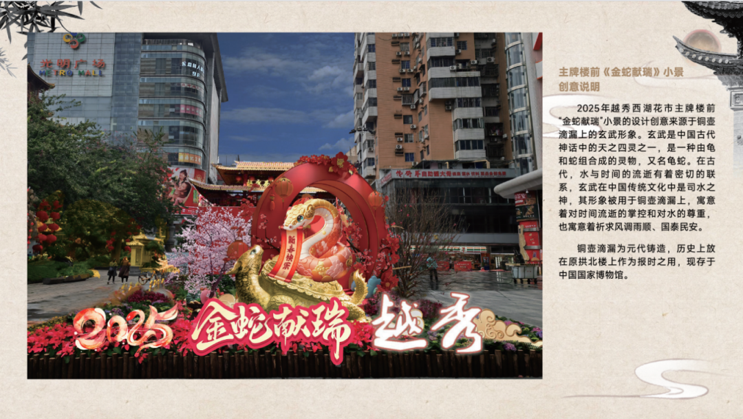 主题蛇年生肖造型,源自北京路铜壶滴漏上的玄武神兽,论说一个更喜乐长从容的广府故事。
