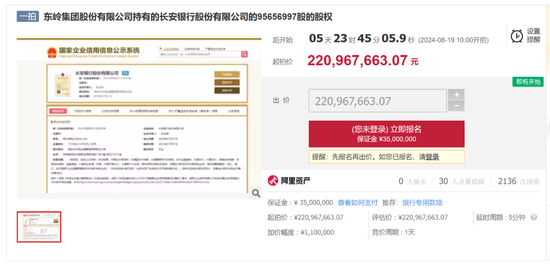 其中,长安银行9565.7万股股权将于8月19日开拍,起拍价即评估价2.21亿元,合每股2.31元;另一笔5103.92万股股权则将于8月22日开拍,起拍价即评估价1.11亿元,合每股2.17元。