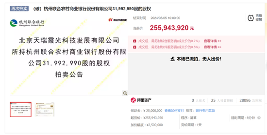 近日,杭州聚拢银行股权拍卖也迎来了最新终端。阿里功令拍卖平台透露,8月5日,杭州聚拢银行3199.3万股股权,最终因无东说念主出价而流拍。据悉,这笔股权的执有东说念主为北京天瑞霞光科技发展有限公司(下称“北京天瑞霞光”),现在该公司仍是歇业。