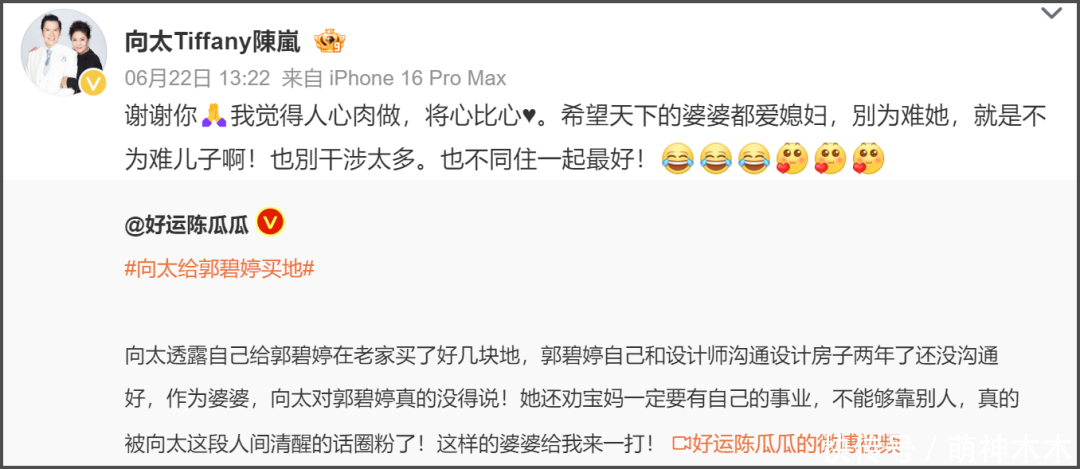 也有网友暗示,郭碧婷四肢权门儿媳也取得不少公道,比如向太给郭碧婷在梓乡买了好几块地盖屋子,还发文大谈“婆媳经”,称“但愿六合的婆婆王人爱媳妇,别为难她,即是不为难犬子”。