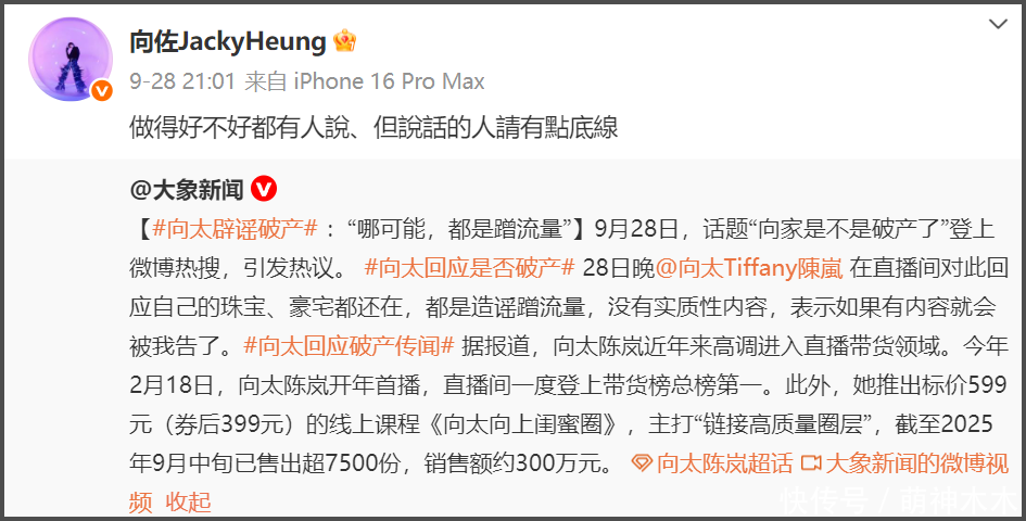 此前向佐否定向家停业传说,但近几年包括向太在内,向家东说念主简直全员搬动出来责任,看上去有些懆急挣钱的嗅觉,也不免会引起网友怀疑。