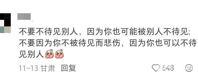 底下这句台词也很好,教化咱们把别东说念主当东说念主,也把我方当东说念主。不纵欲,不谄媚,不因别东说念主的不待见而缅怀,因为咱们也有权力不待见别东说念主,也不要因本人上风而不待见别东说念主,因为别东说念主也总共有权力不待见咱们。