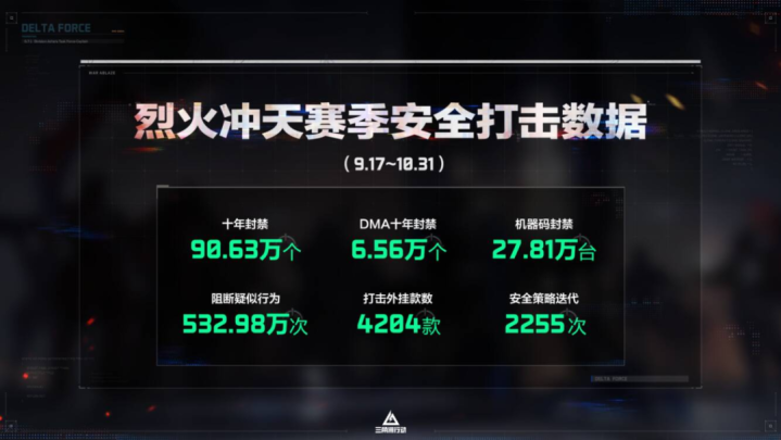 除了线下对外挂制销、外挂陪玩团伙的打击以外,在线上,《三角洲行动》的打击力度也遮盖小觑,官方暴露的数据夸耀,仅上个赛季一个半月期间内喜提10年封禁的外挂账号就达到了90.63万个。
