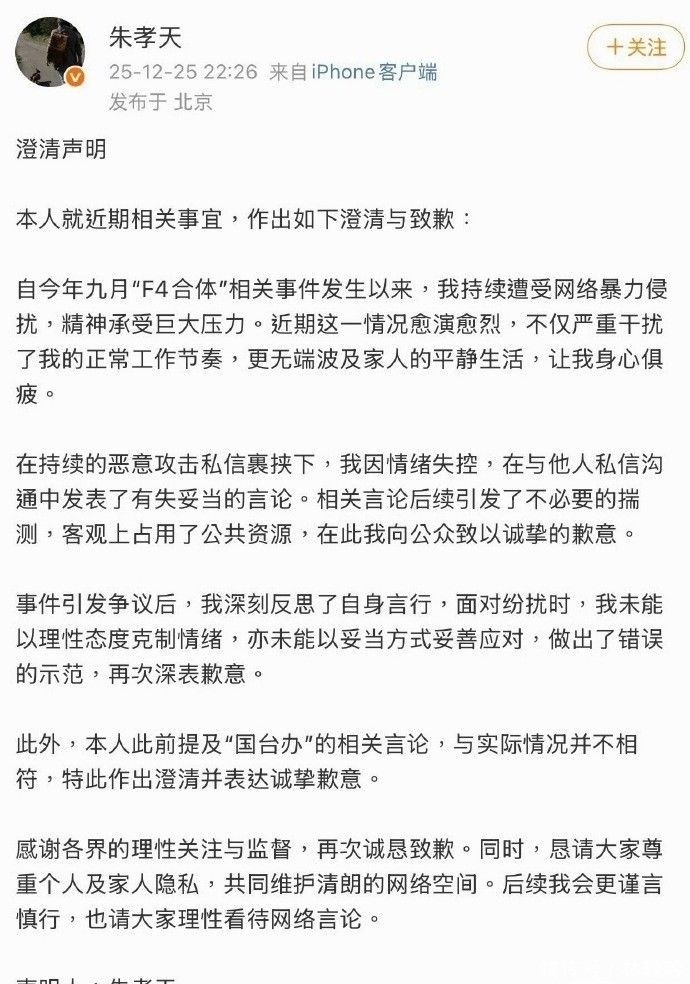 在公论全面反噬的压力下,朱孝天终于于昨晚22:26发布《澄莹声明》,承认我方因热诚波动发表了虚伪言论,并向公众致歉。