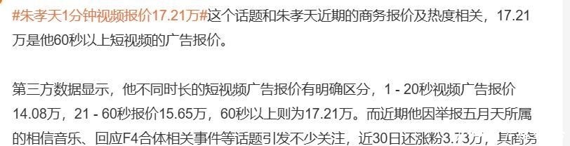 数据清楚,事发前朱孝天一分钟短视频告白报价高达17.21万元;凭借F4怀旧高亢再度翻红后,单条定制视频报价一度飙升至20万元;微博执行更是达到40万元每条的顶峰水平。