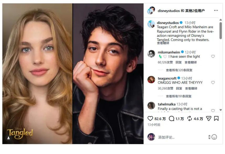 迪士尼:蒂根·克罗夫特与米洛·曼海姆,将在迪士尼动画《魔发奇缘》的真东说念主版电影中,分袂饰演乐佩公主和费林·雷德。