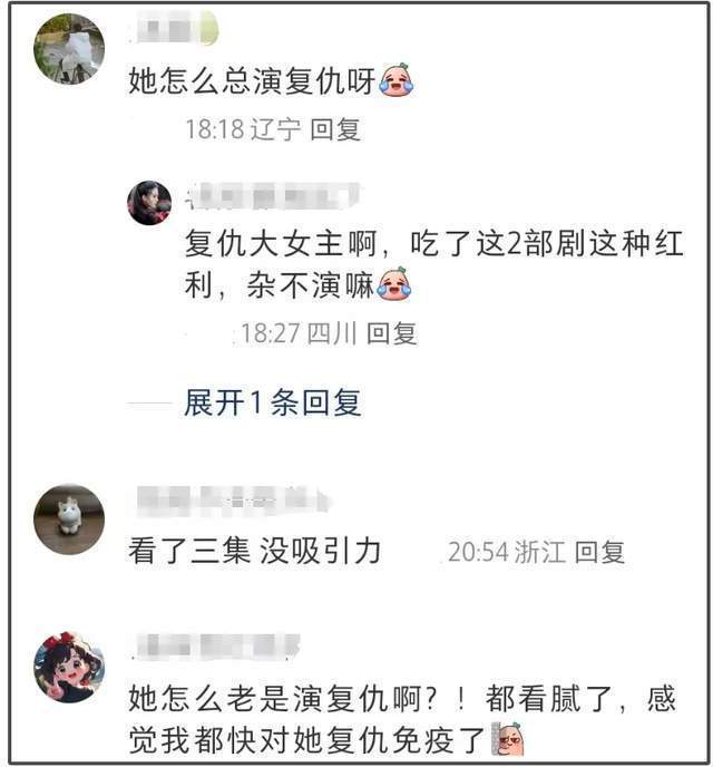 不雅众亦然看腻了吴谨言老是出演复仇女主,审好意思疲顿不说,东谈主设还千人一面,饰演更是方式化,再联念念到她戏外又成婚又怀胎,澈底影响入戏,遭到不啻一位不雅众的吐槽。