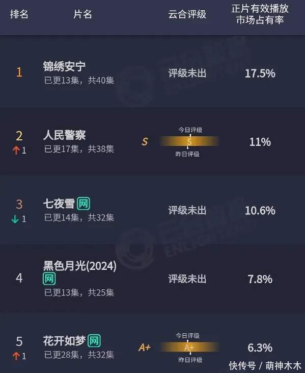凭据专科平台统计,正片有用播放市集占有率排在前三的是《锦绣持重》、《东谈主民傍观》和《七夜雪》,市占率皆在10%以上。
