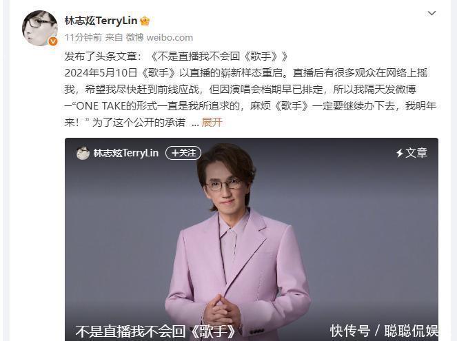 林志炫今天发长文修起为何再上歌手,他说:“固然好多东说念主会问,你依然上过两次歌手,为什么还要来第三次?我心确定'如若不是直播我不会重回歌手'!”。