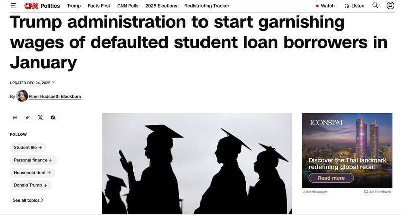 来自好意思国说明部的信息闪现,2026年1月7日起,该部门将运转扣押未能如期还款者的工资,首批受影响的约有1000东谈主,这个数字将逐月增多。好意思国财经媒体CNBC指出,好意思国政府领有的催收权限极度正常,就学生贷款来说,说明部最多不错扣押告贷者工资收入的15%。